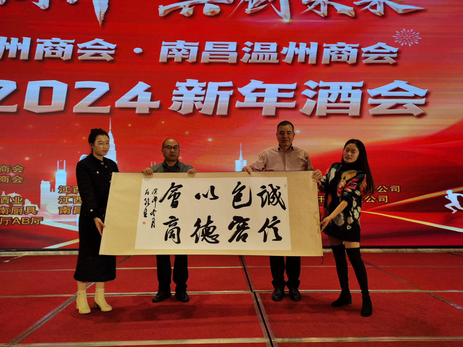 晚会现场,中国书法家协会会员、温州籍书法家吕永生老师向江西温州商会赠送了两幅题字,江西温州商会执行会长兼秘书长胡方德先生代表商会接受了赠送的书法。